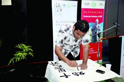 “汉语桥”世界大学生中文比赛斐济赛区的选手在展示书法才艺。