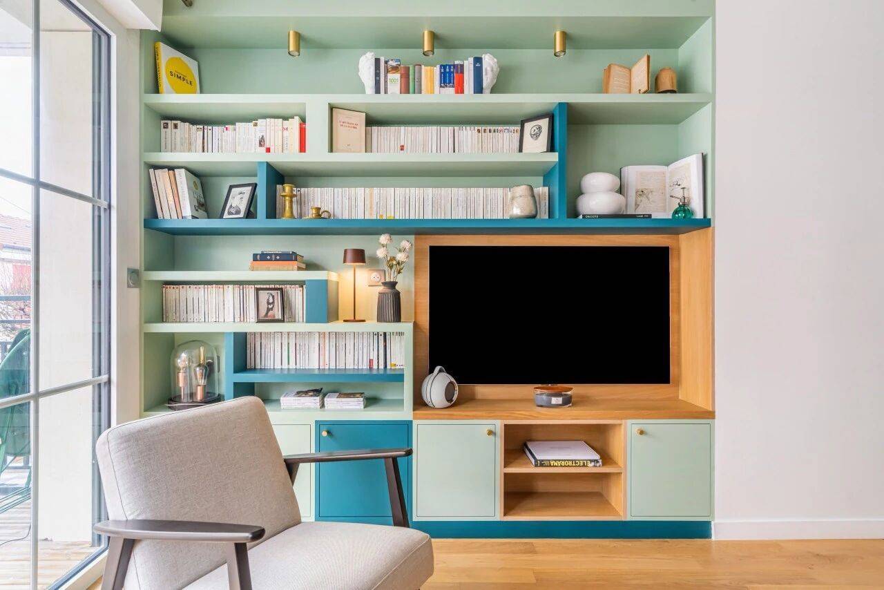 将格子设计成不规则造型,并以一组色彩打破这类家具传统的规整感。