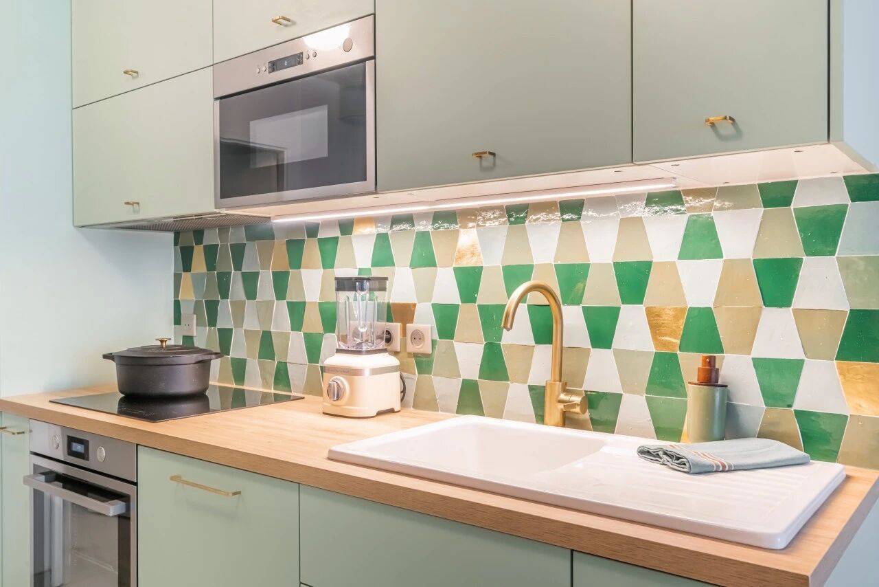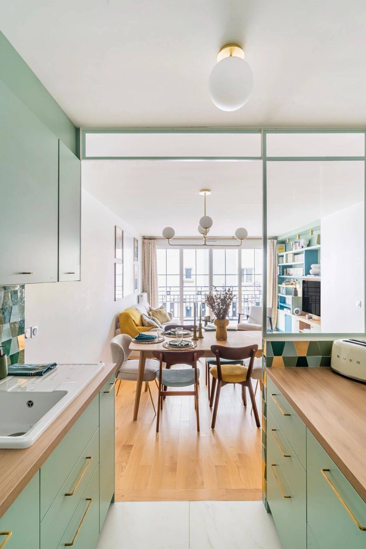 梦想中的杏仁绿色厨房,从原本仅3米长的一字型橱柜,摇身一变成为更契合人体工程学且实用性更强的空间。