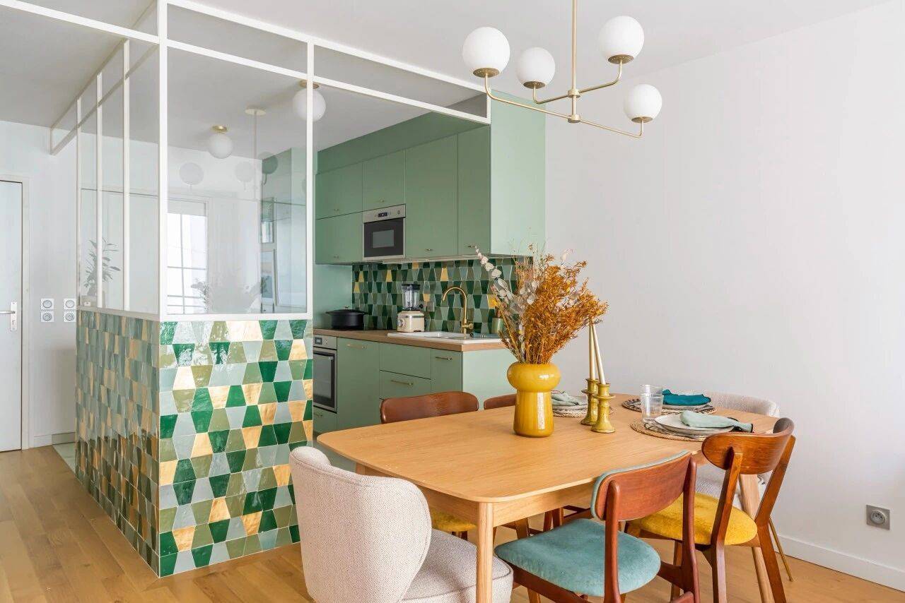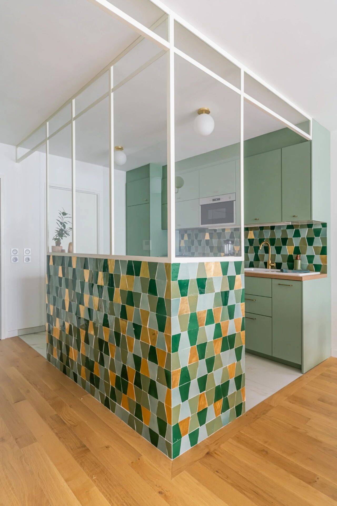 彩釉马赛克瓷砖不仅装饰了厨房的防溅墙,还装点了中岛后方为支撑玻璃隔断而构建的半高墙。