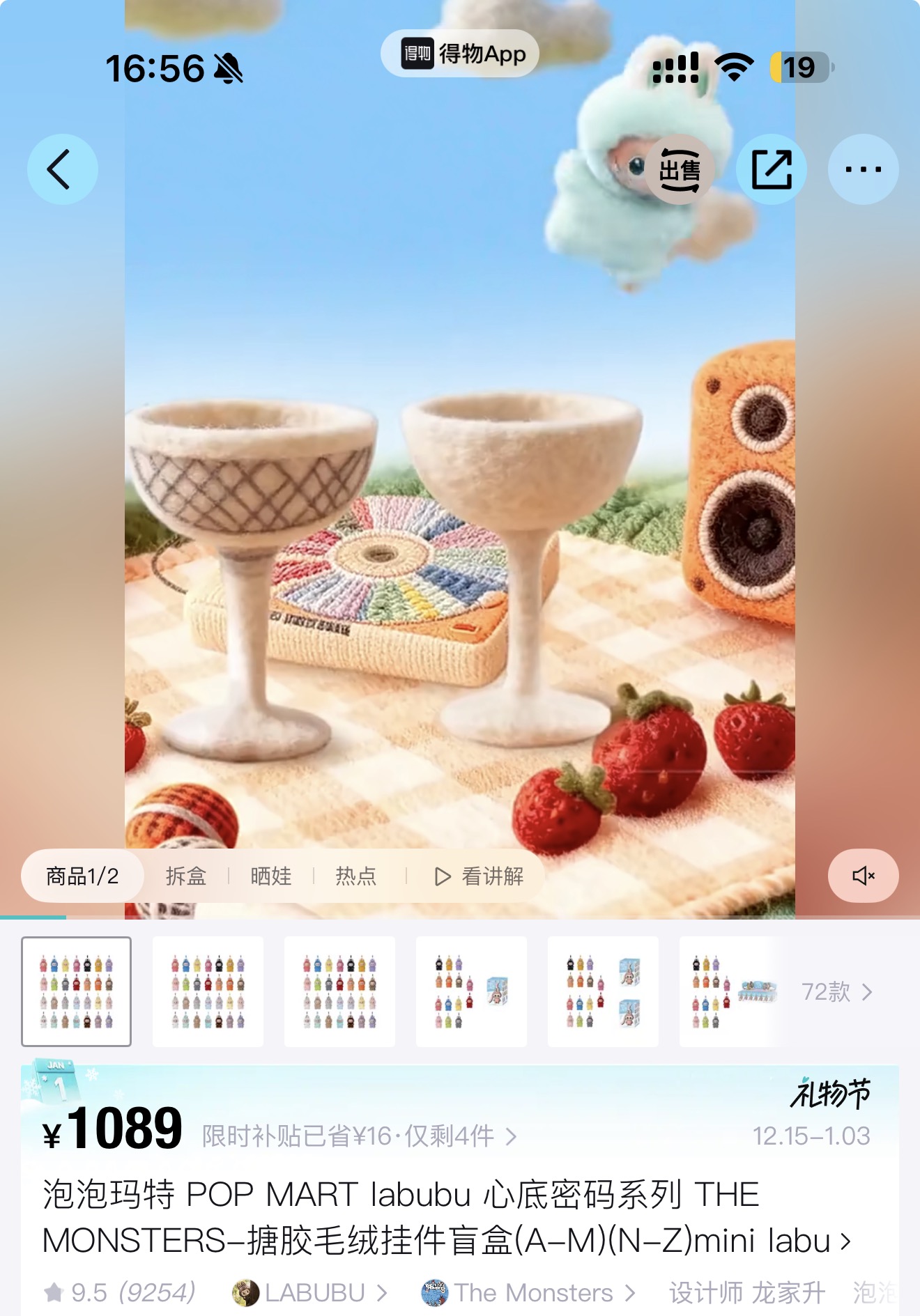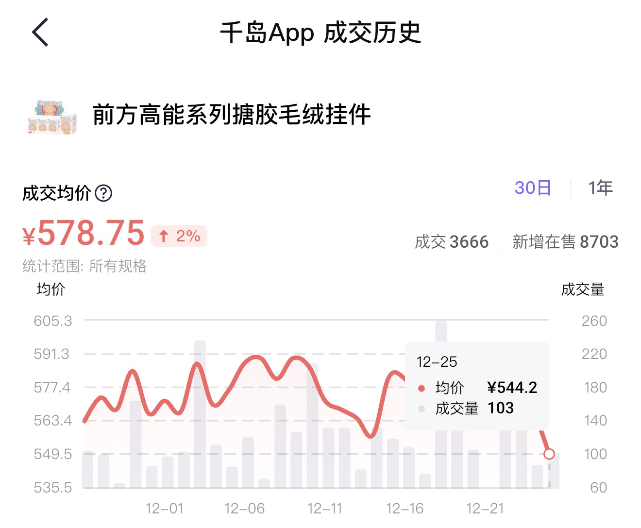 大量补货的连锁效应在潮流交易平台上,记者注意到,在得物app,the monster 心底密码系列(A-M款)已从最高均价2137.71元降至1089元,低于原价;在千岛app,前方高能盲盒端成交均价也从2284.3元降至544.2元,跌破原价。近期补货的the monster象棋大冒险系列中娃和小娃,均回归原价,甚至低于原价。