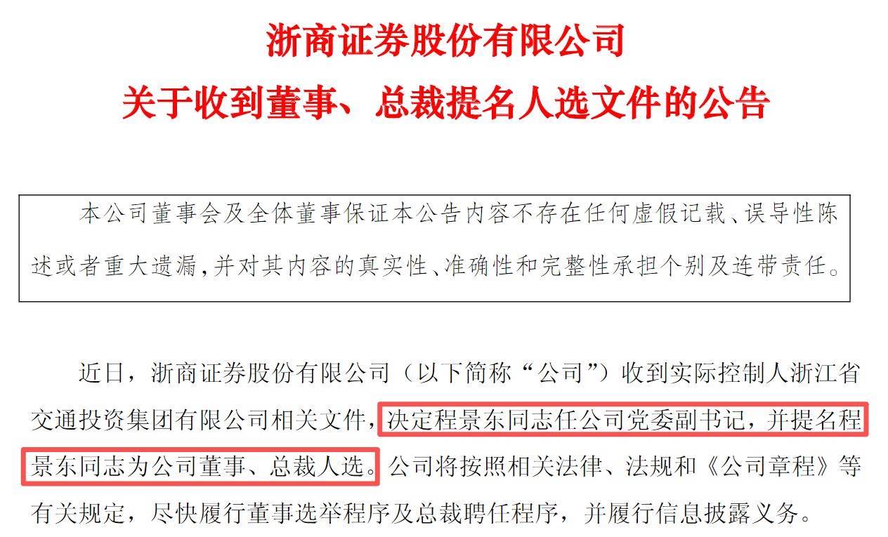 2月11日,浙商证券(601878.SH)迎来重要管理层调整。浙江交通集团正式宣布人事任免决定:现任浙商证券党委委员、副总裁程景东被任命为公司党委副书记,并提名为董事、总裁人选。