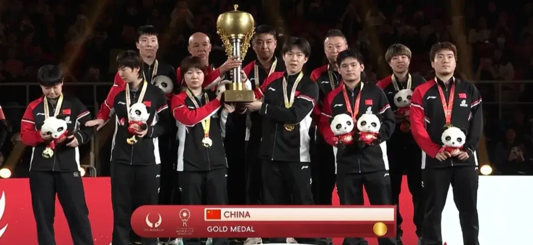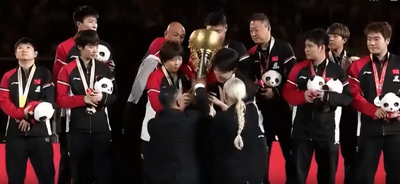 2025混团世界杯颁奖仪式,孙颖莎站到了最边上,奖杯由王皓、肖战、蒯曼和王楚钦共同举起。一是这四个人在C位(中央),二是这个奖杯太沉,两个人举会很重。
